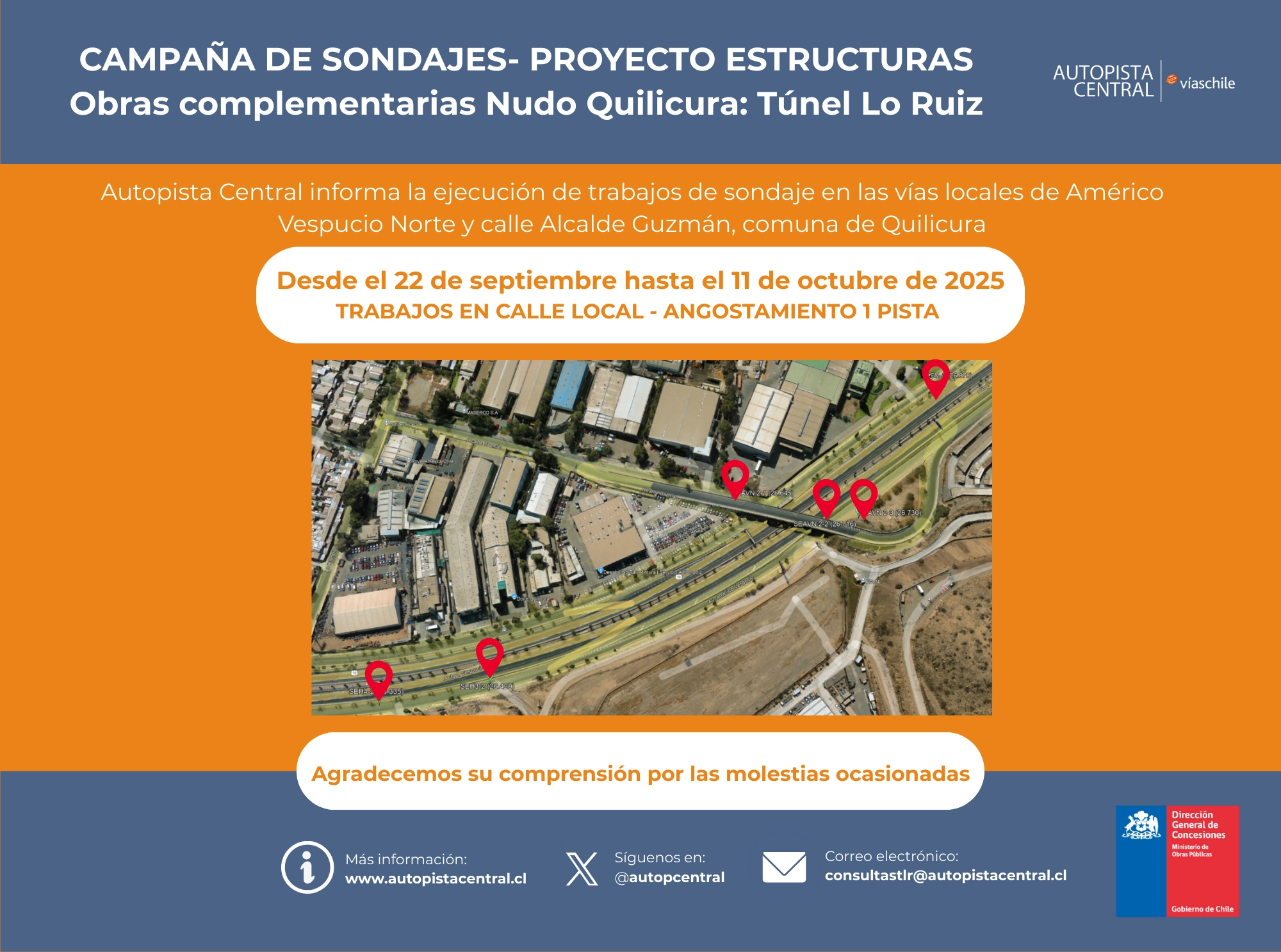 Desde el lunes 22 de septiembre hasta el 11 de octubre de 2025 informamos trabajos de sondaje en las vías locales de Américo Vespucio Norte (norte y sur) y calle Alcalde Guzmán – comuna de Quilicura.